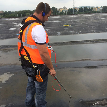 Cette technique sans casse consiste à envoyer une faible impulsion électrique sur une surface mouillée de la toiture terrasse, puis un émetteur de fréquences nous indique les points d’infiltrations détectés.